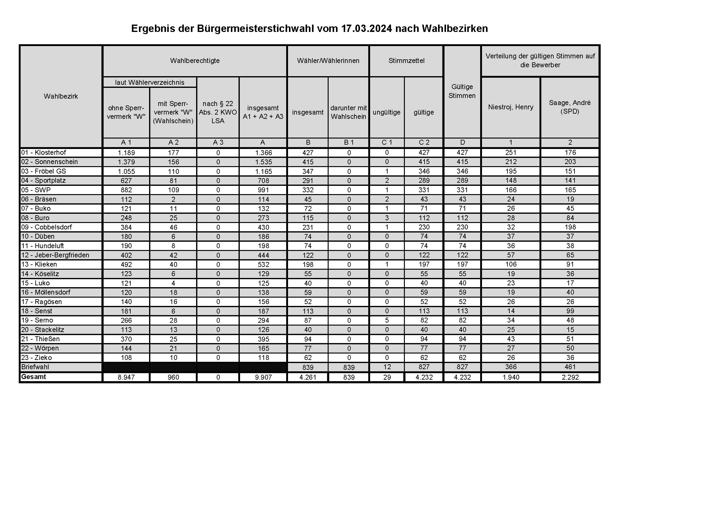 Die Stadt Coswig (Anhalt) informiert: Die Ergebnisse der Wahl (Stichwahl) im Überblick Hier geht es zur Ansicht der Wahlübersicht Übersicht Stichwahl 202439 KBErgebnis Internet (Stichwahl)