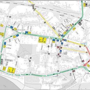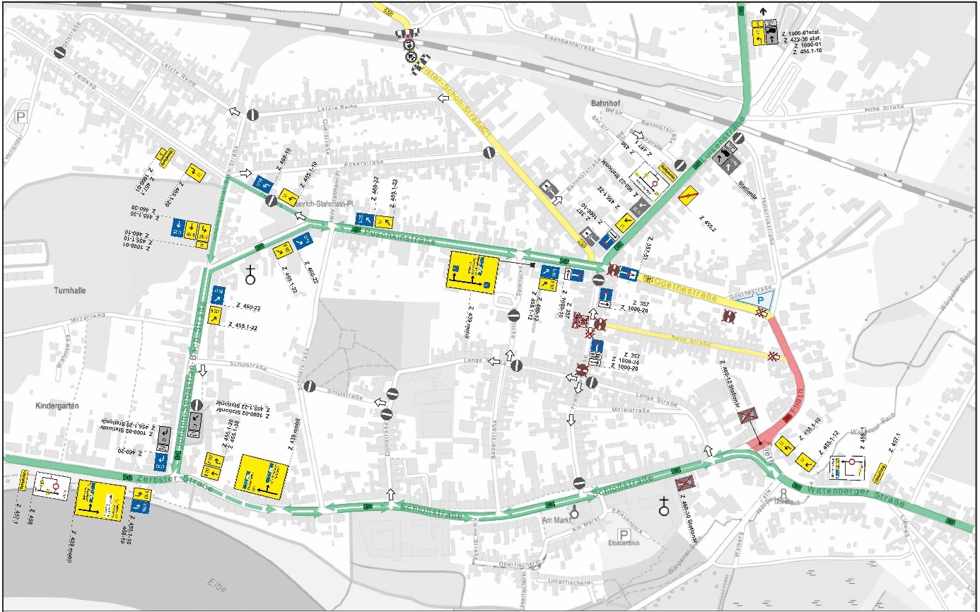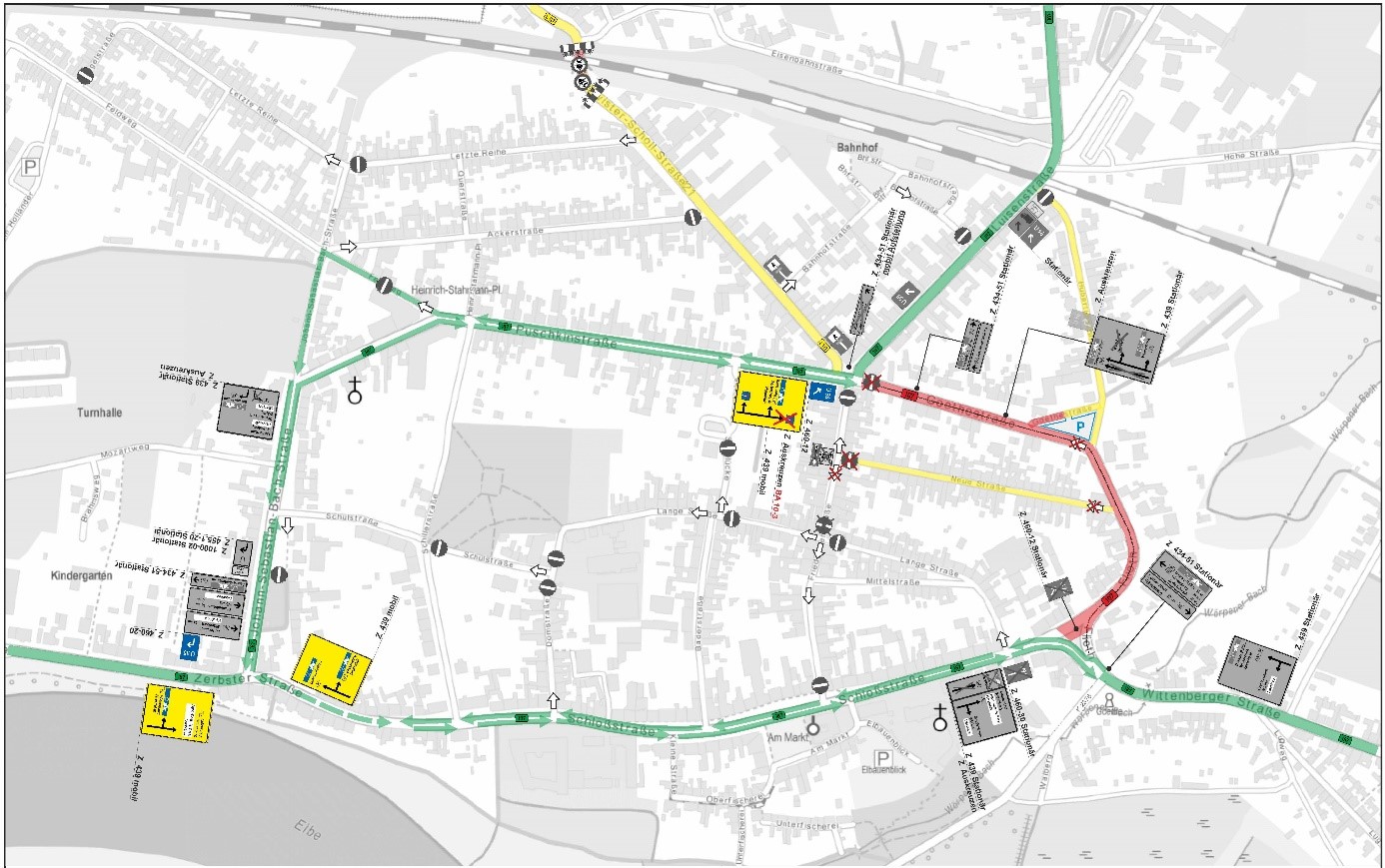 Für die Erreichbarkeit der Coswiger Innenstadt und die Nutzung der vorhandenen Stellplatzanlagen sind umfangreiche Änderungen an der vorhandenen Beschilderung erforderlich und im Verkehrskonzept berücksichtigt.