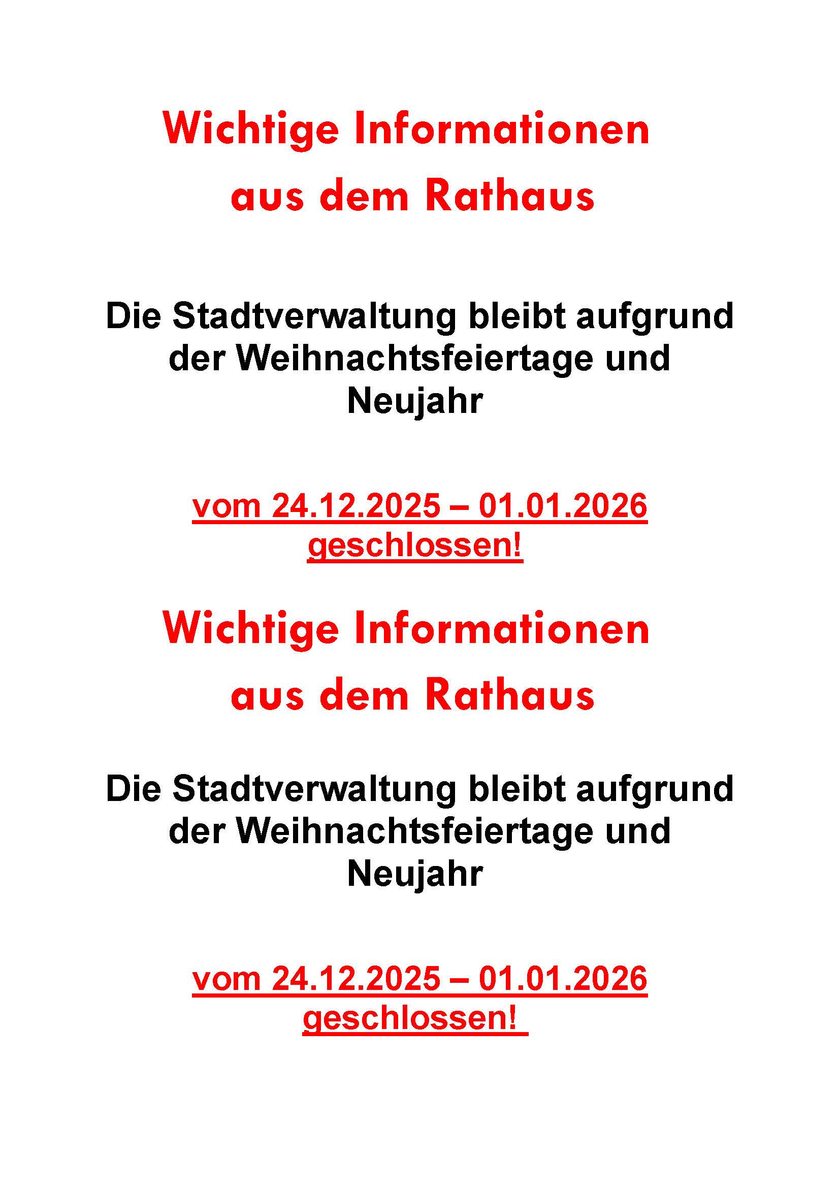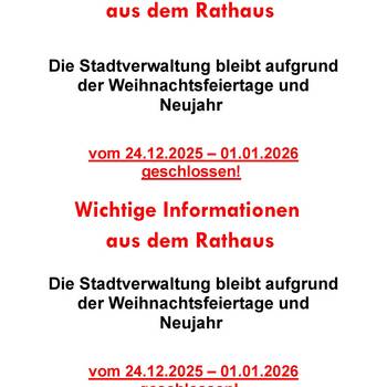 Die Stadt Coswig (Anhalt) informiert: Schließung über die Feiertage Wichtige Informationenaus dem RathausDie Stadtverwaltung bleibt aufgrund der Weihnachtsfeiertage und Neujahrvom 24.12.2025 – 01.01.2026 geschlossen!