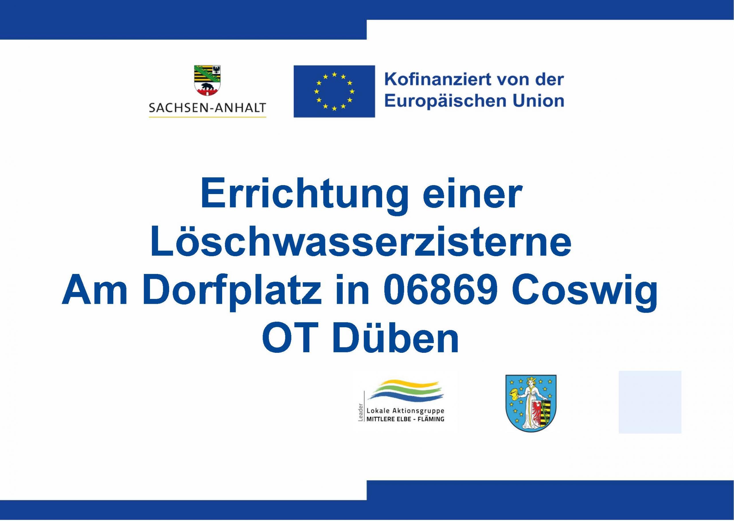 Die Stadt Coswig (Anhalt) informiert: Errichtung einer Löschwasserzisterne Am Dorfplatz in Düben In Düben wird eine Löschwasserzisterne mit Fördergeldern aus der EU errichtet.Bereitstellungstag: 21.05.2025, 13:00 Uhr Erläuterungstafel A3 quer0.2 MB