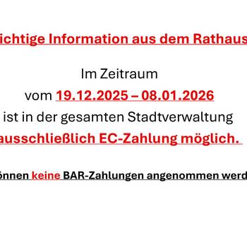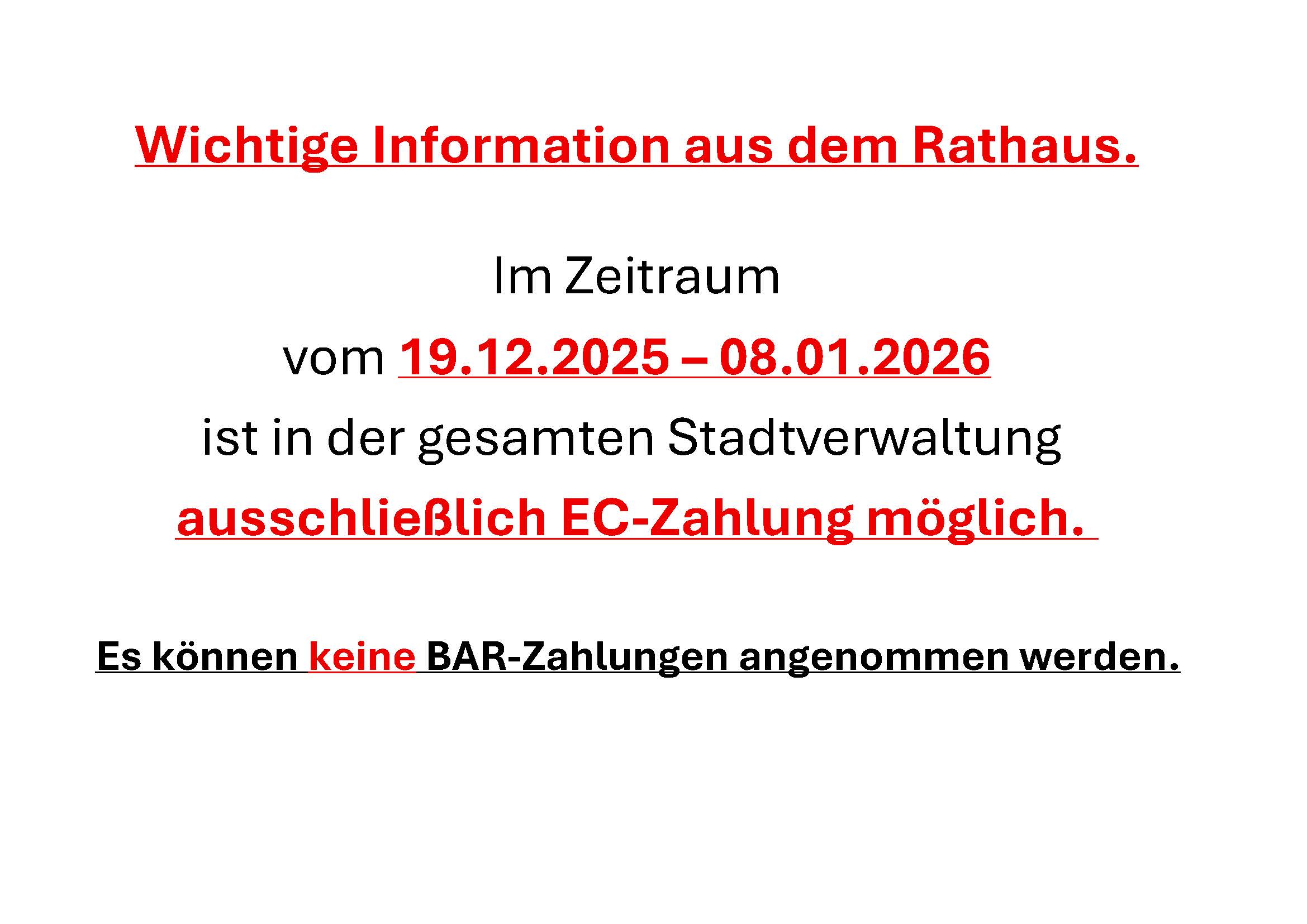 Wichtige Informationen aus dem Rathaus Keine Barzahlung vom 19.12.25-08.01.26 möglich Wichtige Information aus dem Rathaus.Im Zeitraumvom 19.12.2025 – 08.01.2026ist in der gesamten Stadtverwaltungausschließlich EC-Zahlung möglich.Es können keine BAR-Zahlungen angenommen werden.