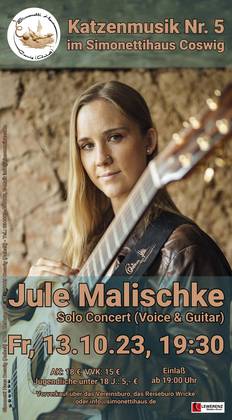Jule Malischke ist eine der aufregendsten Entdeckungen der aktuellen Gitarren- und Singer-Songwriter-Szene. Mit ihrem brillanten Gitarrenspiel bewegt sie sich mühelos zwischen virtuoser konzertanter Gitarrenliteratur, komplexen Fingerstyle-Arrangements und eigenen Songs, die von ihrer außergewöhnlichen Stimme und Bühnenpräsenz geprägt sind. Konzert Nr. 5 der diesjährigen Katzenmusikreihe verspricht ein magischer Abend zu werden.