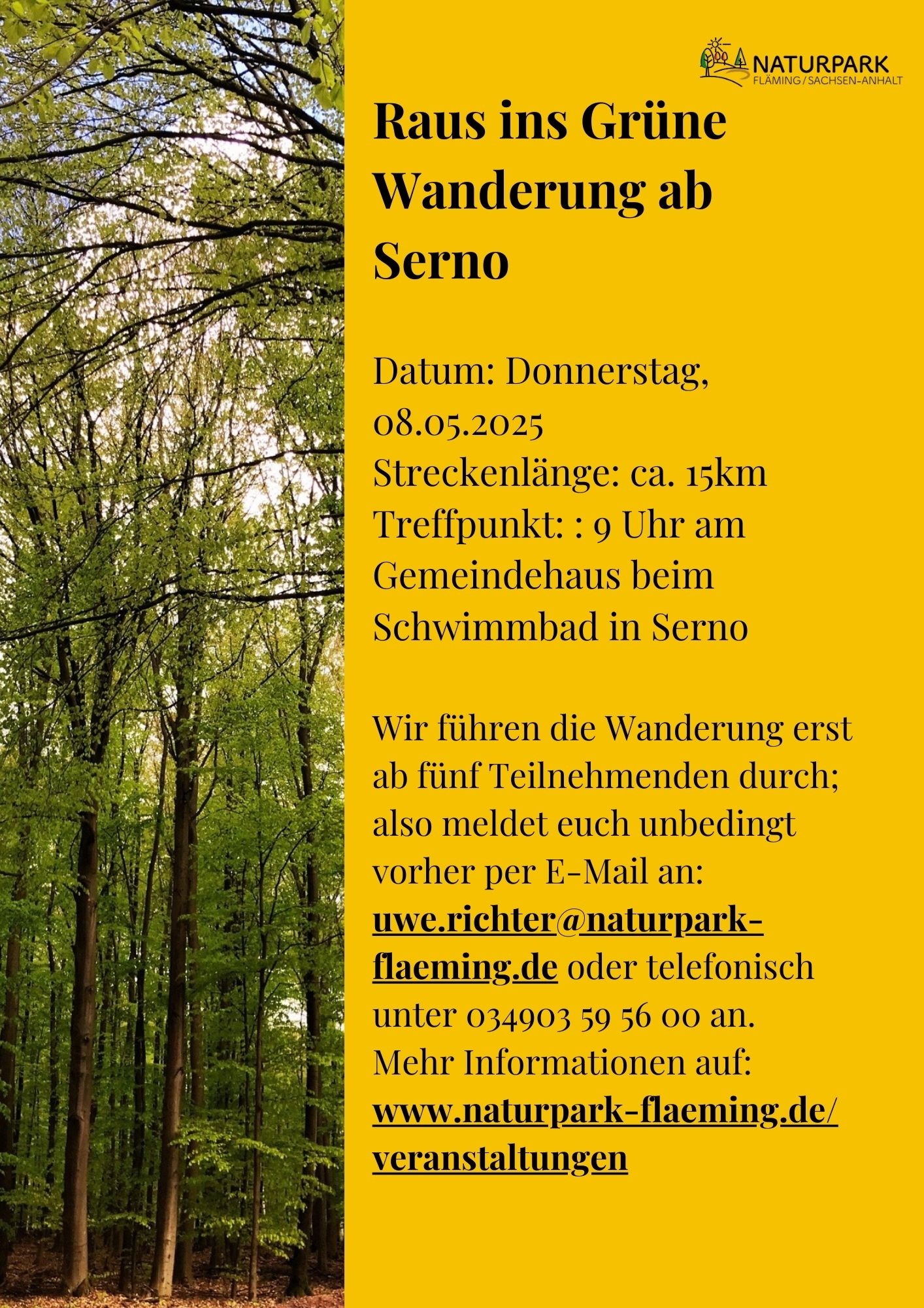 Am Donnerstag, den 8. Mai 2025, bist du herzlich eingeladen, mit uns auf eine abwechslungsreiche Frühlingswanderung durch den Naturpark Fläming zu gehen. Die rund 15 Kilometer lange Strecke startet am Gemeindehaus in Serno und führt über den Setzsteig zu den Flämingbuchen und dem Elefantenstein – zwei beeindruckende Naturdenkmäler der Region. Zum Abschluss der Tour erwartet dich im Gemeindehaus in Serno ein gemütliches Beisammensein mit Kaffee und spannenden Infos rund um den Naturpark.