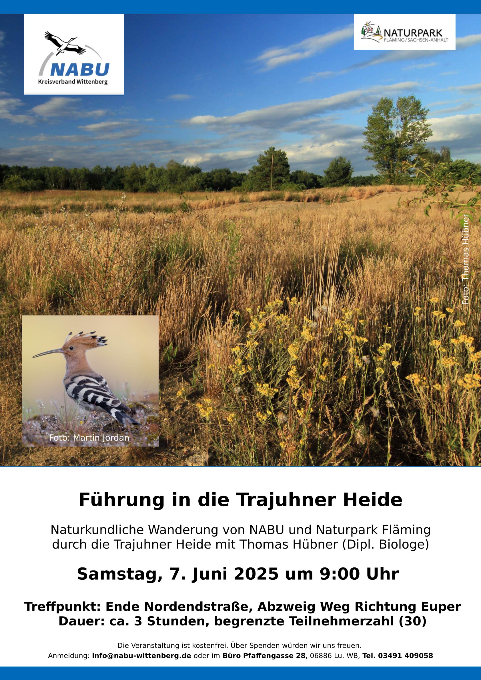 Der NABU und der Naturpark Fläming e. V. laden Dich herzlich zu einer geführten Wanderung durch die faszinierende Landschaft der Trajuhner Heide ein. Die etwa dreistündige Exkursion findet am Samstag, den 7. Juni 2025, von 9 bis 12 Uhr statt. Treffpunkt ist der Parkplatz am Ende der Nordendstraße, am Abzweig des Weges Richtung Euper in Wittenberg.