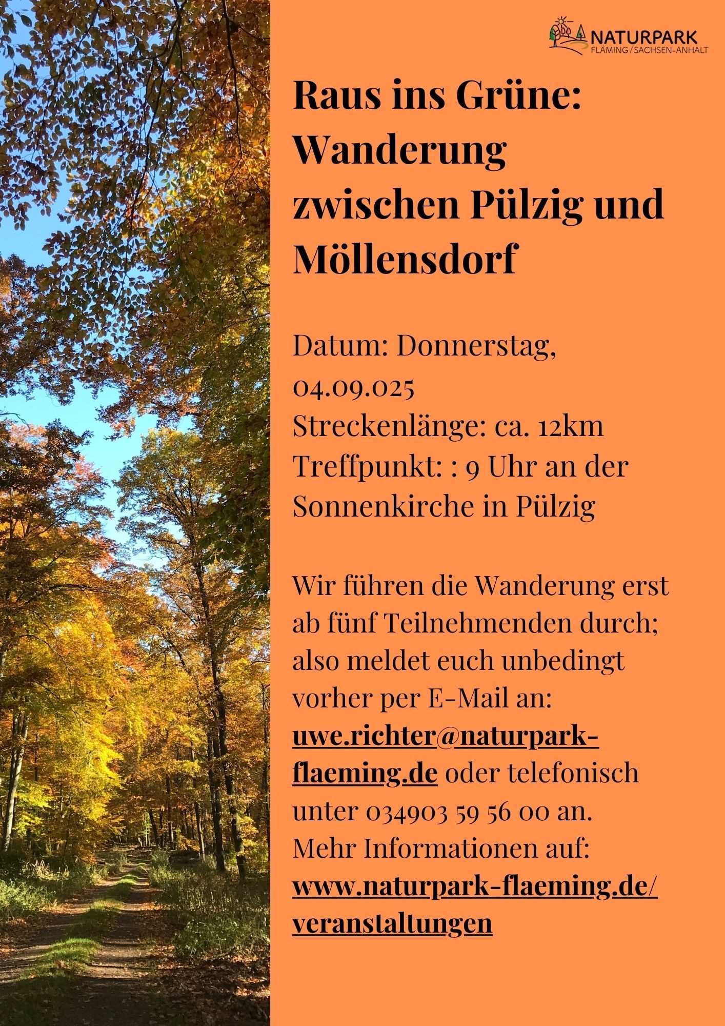 Die Wanderung findet nur statt, wenn sich mindestens fünf Teilnehmende anmelden. Melde dich daher bitte vorab per E-Mail an: uwe.richter@naturpark-flaeming.de oder telefonisch unter 034903 59 56 00.