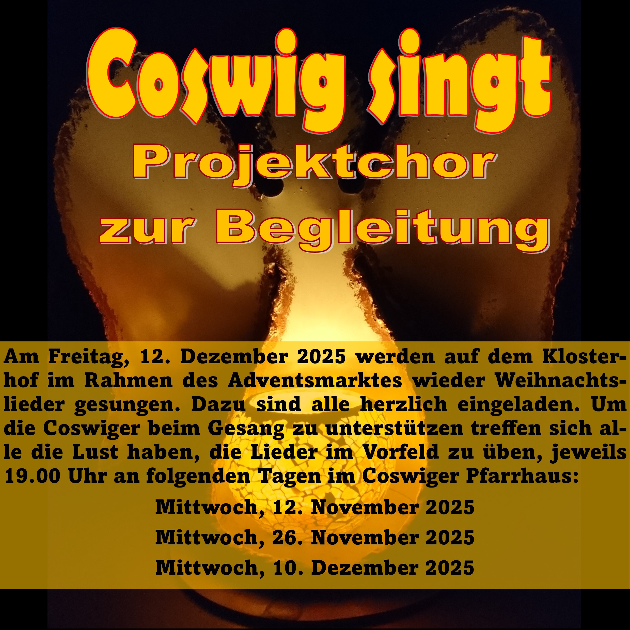 Nach der erfolgreichen Premiere im vergangenen Jahr wollen wir am Freitag vor dem 3. Advent auf dem Klosterhof mit "Coswig singt" eine neue Tradition begründen. Wer sich darauf vorbereiten möchte, ist herzlich zum Projektchor eingeladen. Er trifft sich am