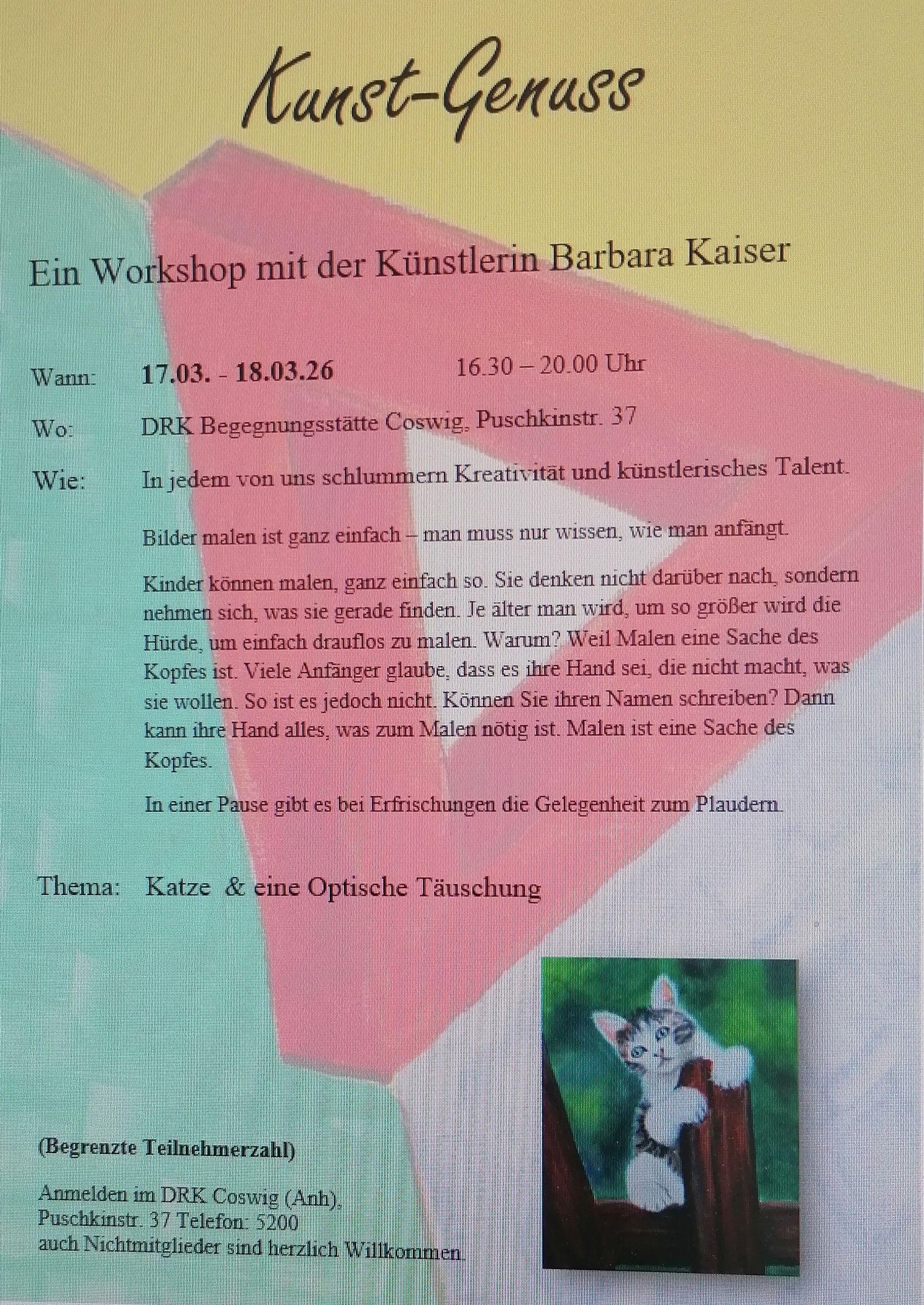 Auch Du kannst malen. Du benötigst keine Vorkenntnisse. Freude am kreativen Tätigsein. Materialien( Farben, Pinsel, Leinwand... erhältst Du gegen einen Unkostenbeitrag vor Ort.