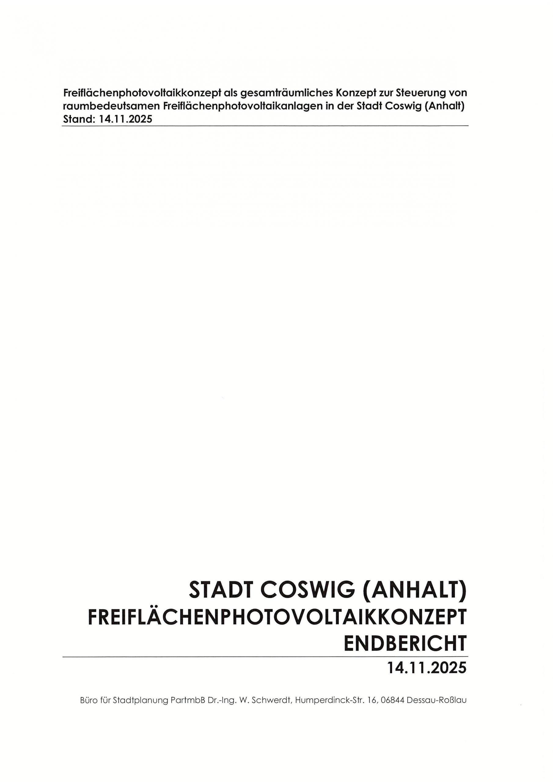 Freiflächenphotovoltaikkonzept der Stadt Coswig (Anhalt) als gesamträumliches Konzept zur Steuerung von raumbedeutsamen Freiflächenphotovoltaikanlagen Stand: 14.11.2025 01 Endbericht 2025 11 144.6 MB 02 Karte 1 Landschaftsbild 2025 11 1411 MB 02 Karte 2 Regioplan Schutzgebiete 2025 11 1414 MB 02 Karte 3 Gesräuml Konzept 2025 11 149.4 MB 03 Kartographische Darstellung14 MB 04 Beschluss Stadtrat1.1 MB