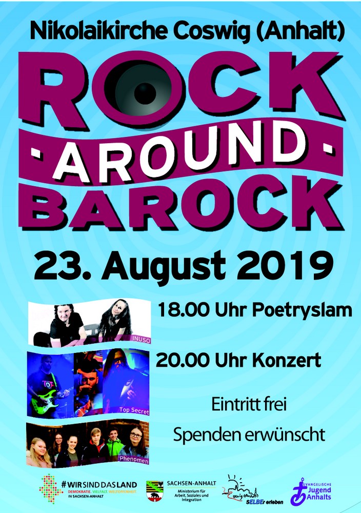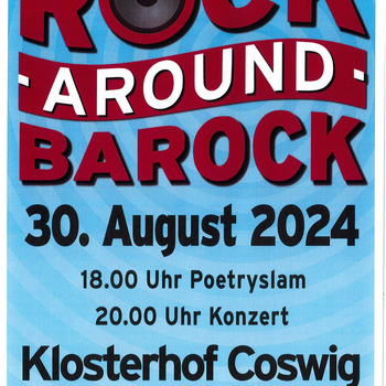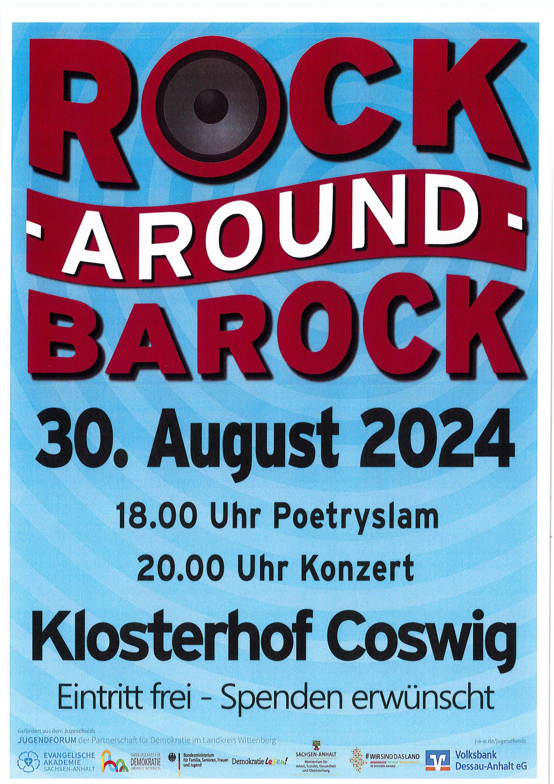 Am Freitag, 30. August 2024 lädt die Junge Gemeinde Coswig/Zieko und die Stadt Coswig (Anhalt) zum achtzehnten Mal zu Rock around Barock ein. Der Poetryslam findet diesmal in der Nikolaikirche statt und das Konzert hören wir Open Air im Klosterhof.