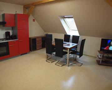 * großer gemeinsamer Aufenthaltsraum mit einem Essbereich sowie einer Sitzecke mit Federkern-Schlaffunktion
