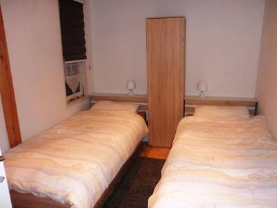 Im Schlafraum stehen zwei Einzelbetten und ein kleiner Schrank.