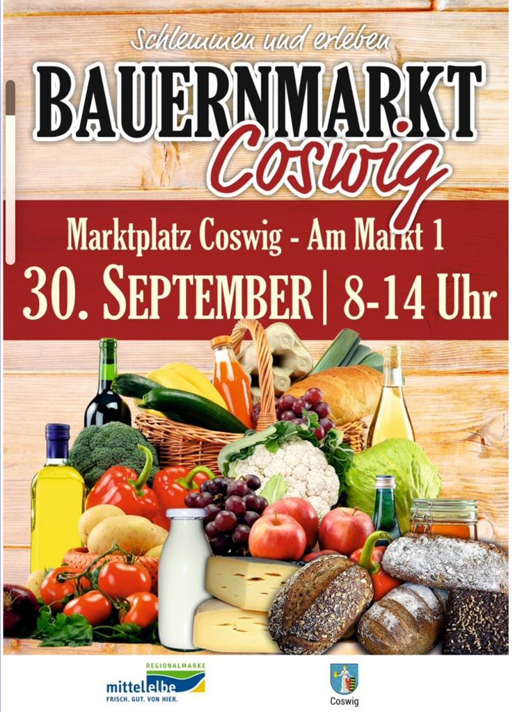 Es ist endlich wieder soweit! Am Samstag, den 30.09.2023 findet in Kooperation mit der Regionalmarke Mittelelbe e.V. der regionale Bauernmarkt auf dem Marktplatz (Am Markt 1) in Coswig (Anhalt) statt.