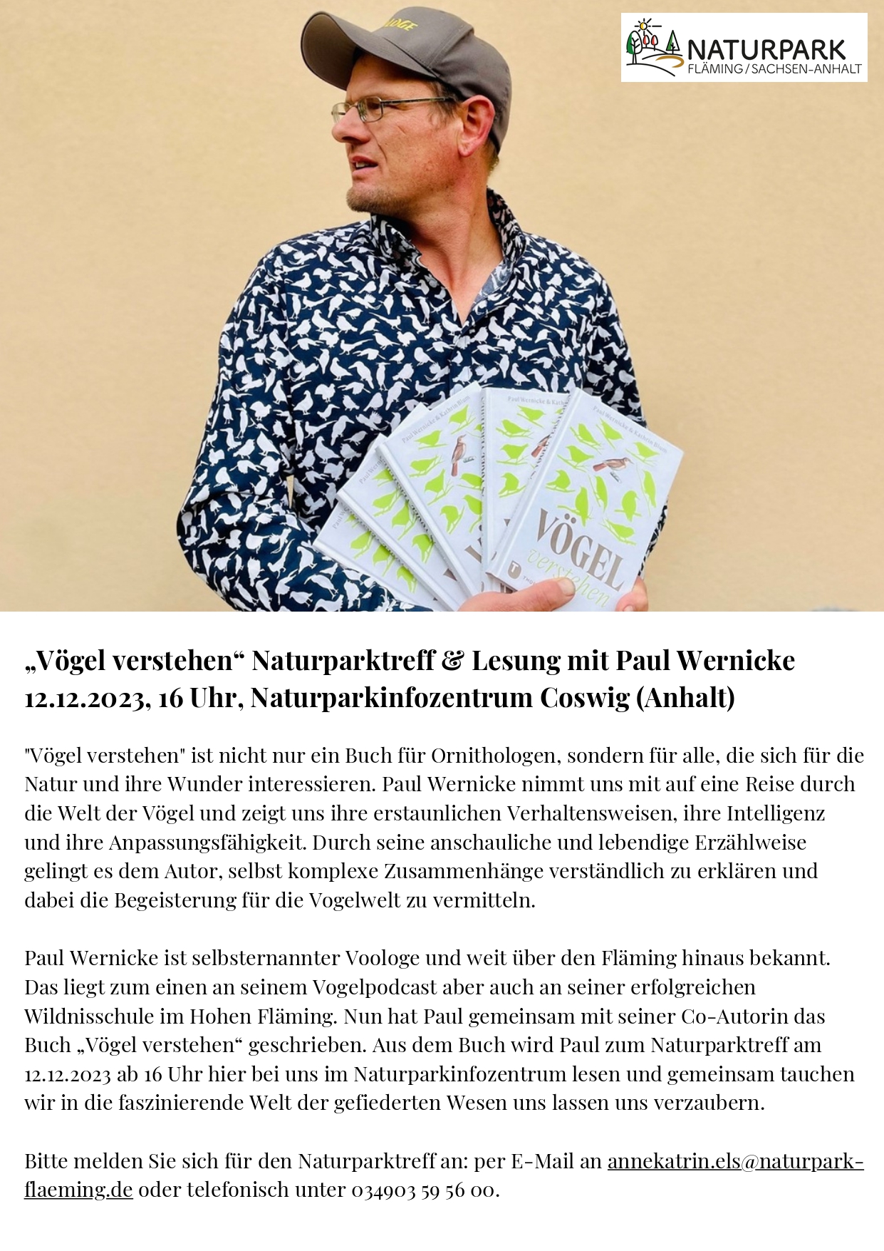 Paul Wernicke ist selbsternannter Voologe und weit über den Fläming hinaus bekannt. Das liegt zum einen an seinem Vogelpodcast aber auch an seiner erfolgreichen Wildnisschule im Hohen Fläming. Nun hat Paul gemeinsam mit seiner Co-Autorin das Buch „Vögel verstehen“ geschrieben. Aus dem Buch wird Paul zum Naturparktreff am 12.12.2023 ab 16 Uhr hier bei uns im Naturparkinfozentrum lesen und gemeinsam tauchen wir in die faszinierende Welt der gefiederten Wesen uns lassen uns verzaubern.