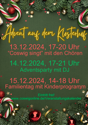 Erstmalig wird es rund um den Klosterhof an drei Tagen Programm geben. Freuen Sie sich auf "Coswig singt" am Freitag. Die Chöre der Stadt laden zum Mitsingen adventlicher und weihnachtlicher Lieder ein. Der Samstag ist den Partygängern vorbehalten. Am Sonntag traditionell das farbenfrohe Weihnachtsprogramm der Coswiger Kindereinrichtungen, der Teenie-Dancer, von Vereinen und dem Posaunenchor.