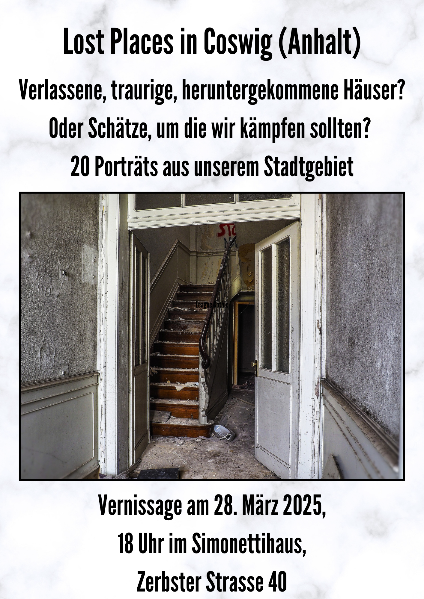 20 ausgewählte Objekte in zentraler Lage von Coswig gelegen, die geradezu nach Sanierung und Nutzung schreien, bildet die Foto-Ausstellung Lost Places ab, die ab 28. März 2025 im Simonetti Haus zu sehen sein wird.