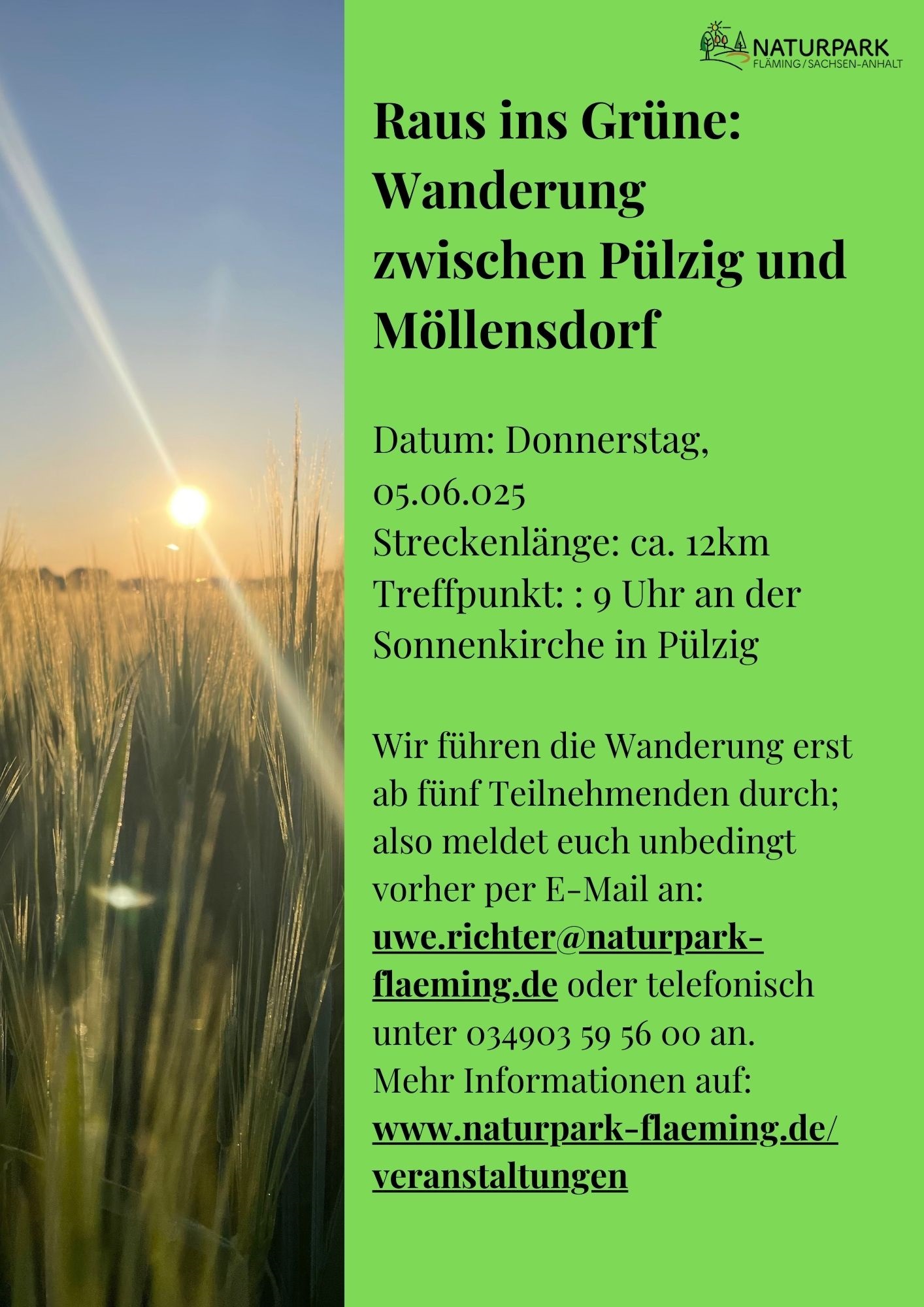 Die Wanderung findet nur statt, wenn sich mindestens fünf Teilnehmende anmelden. Melde dich daher bitte vorab per E-Mail an: uwe.richter@naturpark-flaeming.de oder telefonisch unter 034903 59 56 00.